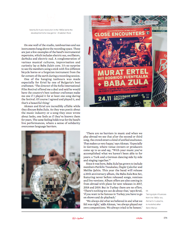 Since it was born, Baba Zula has grown to include members Periklis Tsoukalas, Özgür Çakırlar and Melike Şahin. This year the band will release a 20th anniversary album, the Baba Zula Box Set, featuring never before released songs, remixes and live versions. Album offers are also coming in from abroad with plans for new releases in 2017, 2018 and 2019. But in Turkey there are no offers. ‘There’s nothing we can do about that,’ says Ertel, ‘if you want to be famous in Turkey you have to go on shows and do playback.’