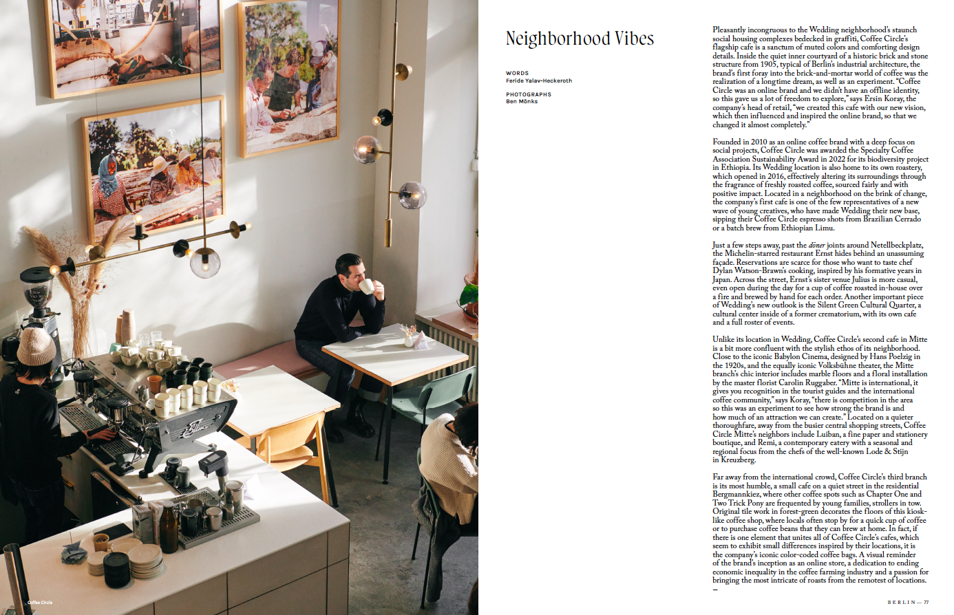 Founded in 2010 as an online coffee brand with a deep focus on social projects, Coffee Circle was awarded the Specialty Coffee Association (SCA) Sustainability Award in 2022 for its biodiversity project in Ethiopia. Its Wedding location is also home to its own roastery, which opened in 2016, effectively altering its surroundings through the fragrance of freshly roasted coffee, sourced fairly and with positive impact. Located in a neighborhood on the brink of change, the company’s first café is one of the few representatives of a new wave of young creatives that have made Wedding their new base, sipping their Coffee Circle espresso shots from Brazilian Cerrado or a batch brew from Ethiopian Limu.
