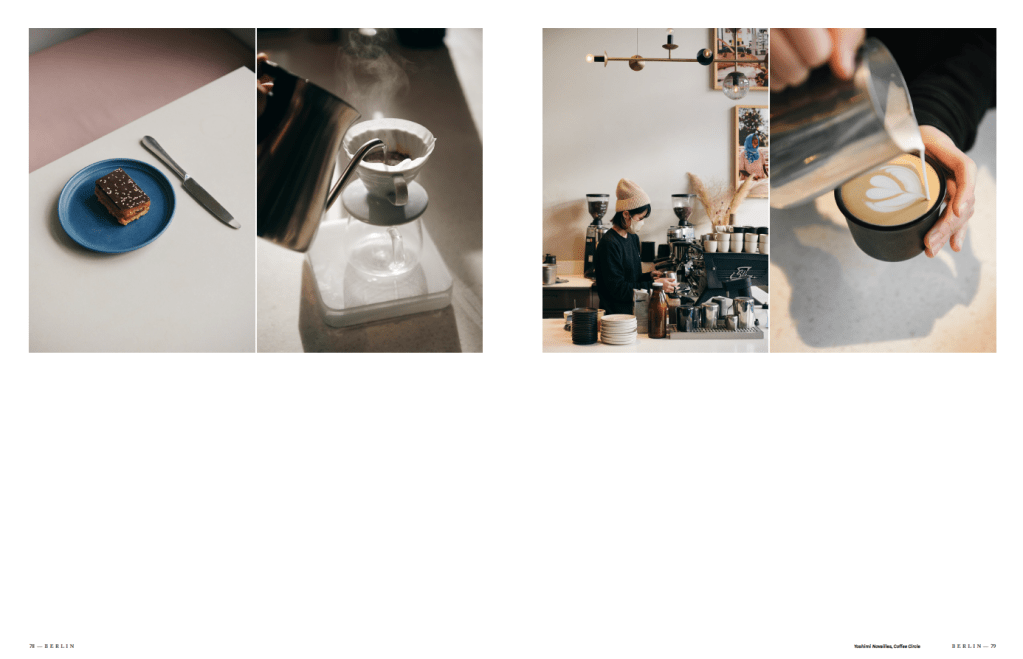 Far away from the international crowd, Coffee Circle’s third branch is its most humble, a small café on a quiet street in the residential Bergmannkiez, where other coffee spots such as Chapter One and Two Trick Pony are frequented by young families, their strollers in tow. Original tile work in a forest green decorates the floors of the kiosk-like Coffee Circle Bergmannkiez, where locals often stop by for a quick cup of coffee or to purchase coffee beans that they can brew at home. In fact, if there is one element that unites all of Coffee Circle’s cafes, which seem to exhibit small differences inspired by their locations, it is this shelf exhibiting their iconic color-coded coffee bags. A visual reminder of the brand’s inception as an online store, a dedication to ending economic inequality in the coffee farming industry and a passion for bringing the most intricate of roasts from the remotest of locations.