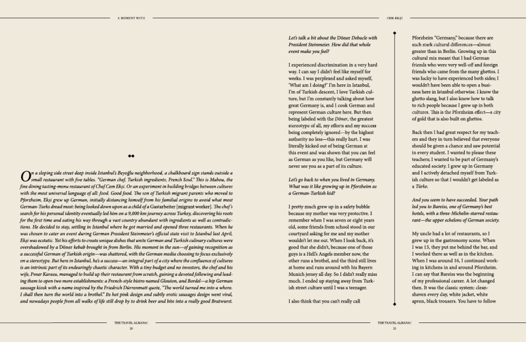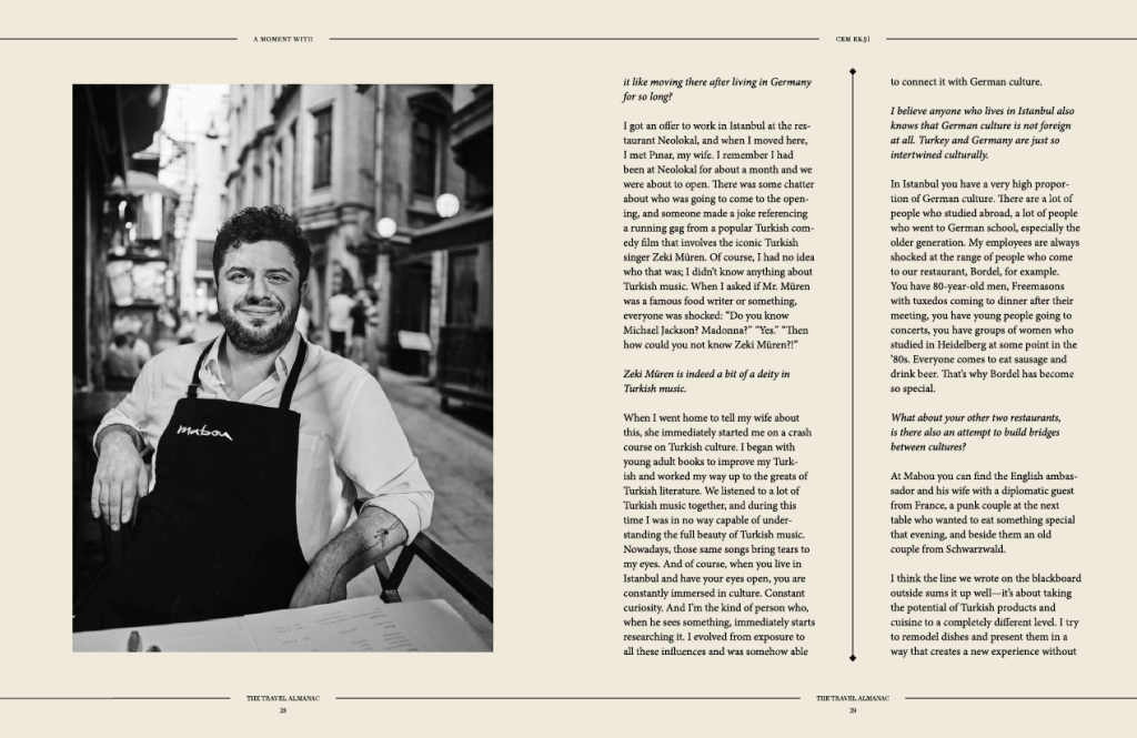The son of immigrant Turkish parents who moved to Pforzehim, Ekşi grew up German, initially deflecting away from his Turkish roots to avoid what most German-Turks dread most: being looked down upon as the child of a Gastarbeiter [migrant worker]. The chef’s search for his own identity led him on a 9,000 km journey through Turkey, discovering his roots for the first time, eating his way through a vast country abundant with ingredients as well as contradictions. He decided to stay, settled in Istanbul, got married, opened three restaurants.