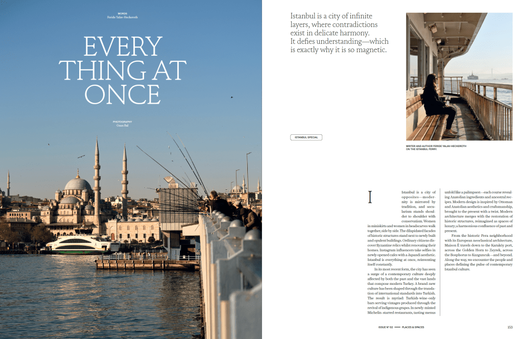 In its most recent form, the city has seen a surge of a contemporary culture deeply affected by both the past and the vast lands that compose modern Turkey. A brand-new culture has been shaped through the translation of international standards into Turkish. The result is myriad: Turkish-wine-only bars serving vintages produced through the revival of indigenous grapes. In newly-minted Michelin-starred restaurants, tasting menus unfold like a palimpsest—each course revealing Anatolian ingredients and ancestral recipes. Modern design is inspired by Ottoman and Anatolian aesthetic and craftsmanship, brought to the present with a twist. Modern architecture merges with the restoration of historic structures, reimagined as spaces of luxury; a harmonious confluence of past and present.