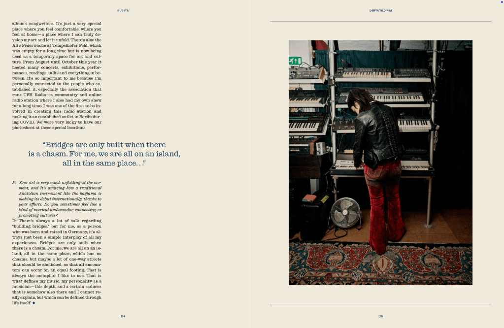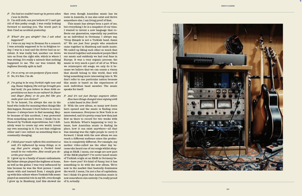 With the new album, so many new doors have opened and the music is finding even more resonance. Everyone in New York is so interested, and it’s pretty crazy how they just flew us there to record for two weeks with Leon Michels. What’s happening is very intense, how Anatolian music is finding its place, how it can exist anywhere—all that was missing was the right people to carry it forward. I think with the new album we can reach a different audience since the production is completely different. For example, my mother video-called me the other day because she heard one of our songs whilst shopping at H&M. I mean, our songs are now part of the H&M playlist?! I’ve never heard music of Turkish origin at an H&M in Germany before—have you? It’s kind of funny, but it has something to do with the new album. We’re now in the market that basically dominates the world. I mean, I’m not a fan of capitalism, but I think it’s great that Anatolian music is now somewhere else entirely. I’m really proud of it, actually.
