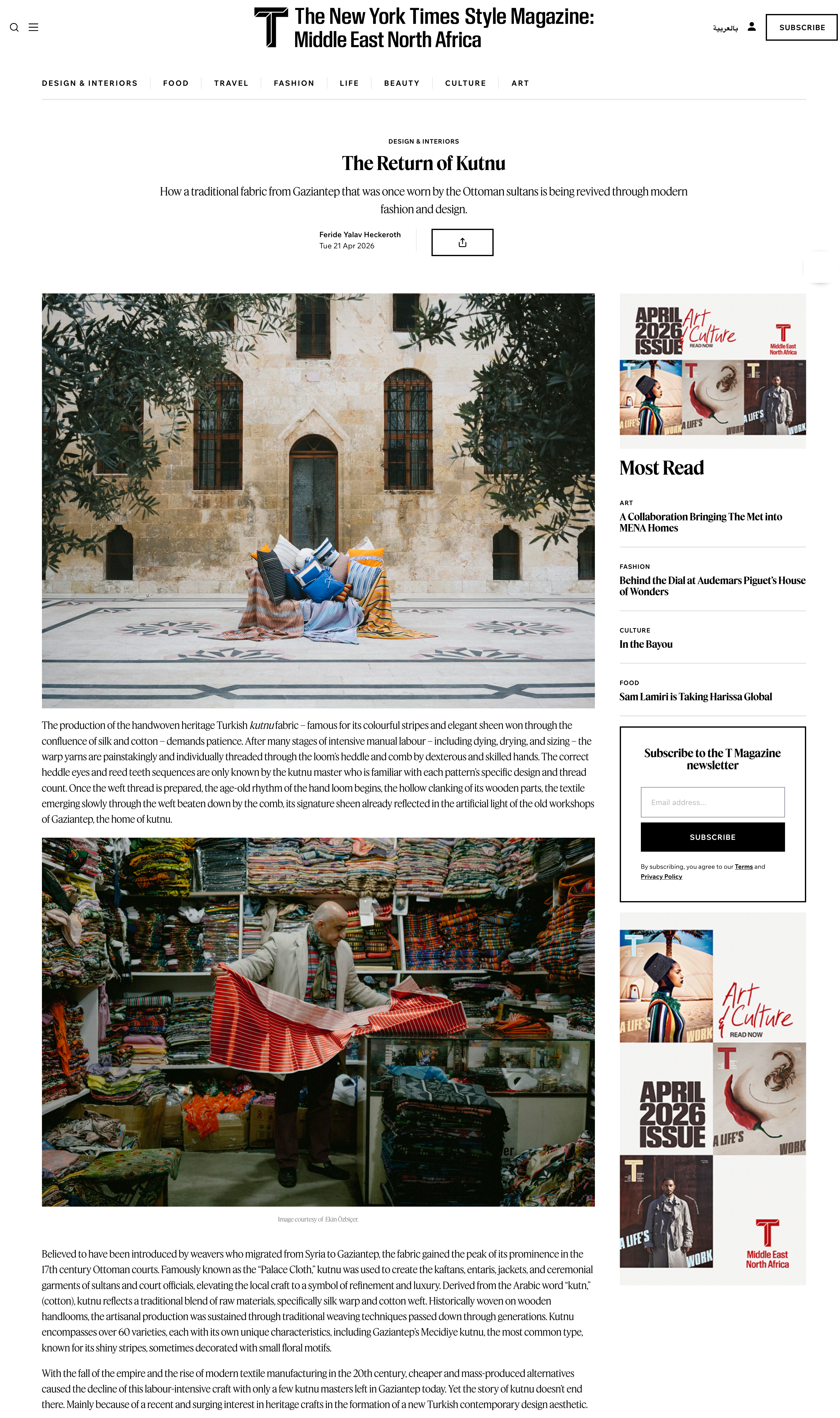 My first feature for the newly launched The New York Times Style Magazine MENA is all about the revival of kutnu, a traditional hand woven fabric from Gaziantep once worn by the Ottoman sultans.
